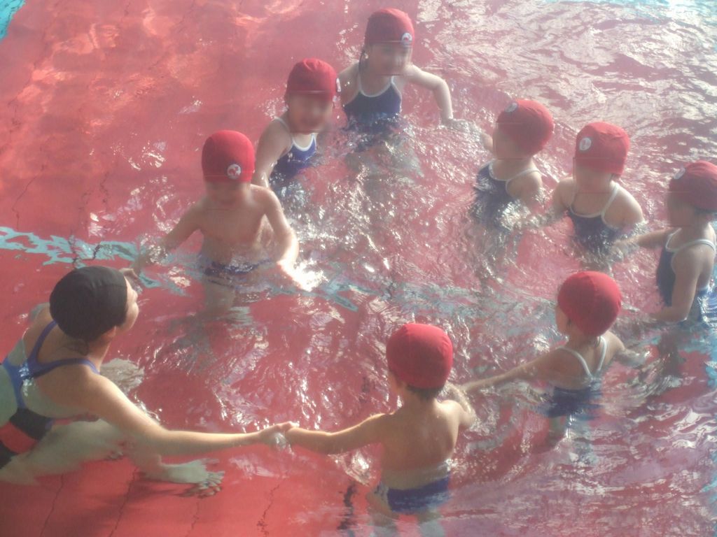スイミングスクール 習い事 2009.01.15(木) 《とり》が毎週木曜日に通っているスイミングスクールの様子です。写真は見学用スペースからガラス越しに撮ったので、ちょっと粗いですね。右側の写真は先生の右隣にいるのが《とり》です。 見学の間、《いぬ》は、はしゃいでいましたが、急に《へび》の膝の上にやってきて『寝る』と言って、数秒で寝てしまいました。