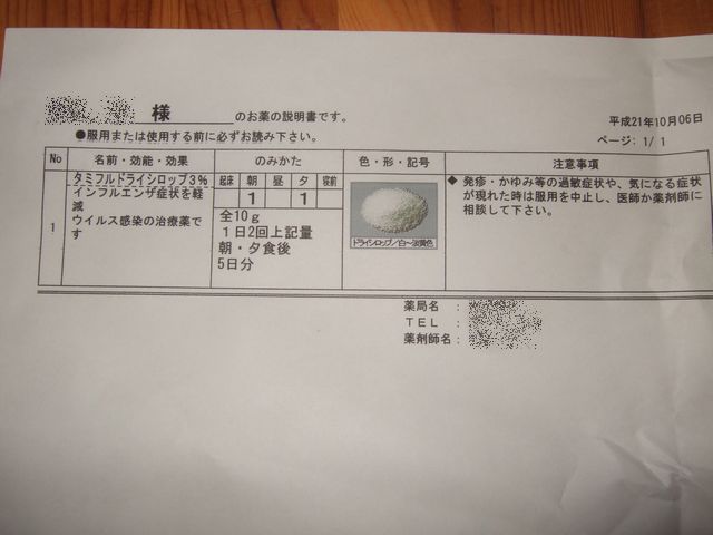 昨日の夜から《とり》が発熱しましたが、朝には36.5度に熱は下がっていました。咳もしていたので、一応小児科にいったら新型インフルエンザと診断されました。別に苦しんでいる様子もなく、1日で熱も下がっていますが、5日分のタミフルを処方されました。《たつ》だけはマスク着用で会社に行きますが、《へび》、《とり》、《いぬ》は、少なくとも週末までは外出せずに家でおとなしくしておきます。