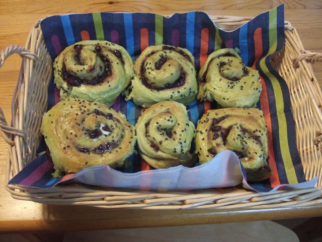 あずきパン 食べ物 2009.10.07(水) 《へび》、《とり》、《いぬ》は外に出れないので、抹茶ベースの生地であずきパンを焼きました。《とり》が作りたいと言い出したのに、一次発酵中に寝てしまいました。焼きあがった頃にタイミングよく起きてきて食べていました。 《たつ》は翌日の朝食時に頂きました。あずきのほんのりした甘味がおいしかったです。