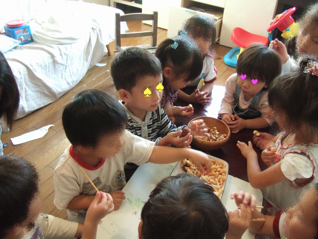 おやつ争奪戦 お友達 2009.10.21(水) 幼稚園が終わってからお友達のお家に遊びに行きました。6家族が集まり子供13人、大人6人、計19人です。1歳児から小学校1年生まで勢ぞろいでした。おやつの争奪戦では、《いぬ》は身を乗り出して必死になっていました。お兄ちゃん達に負けていません!