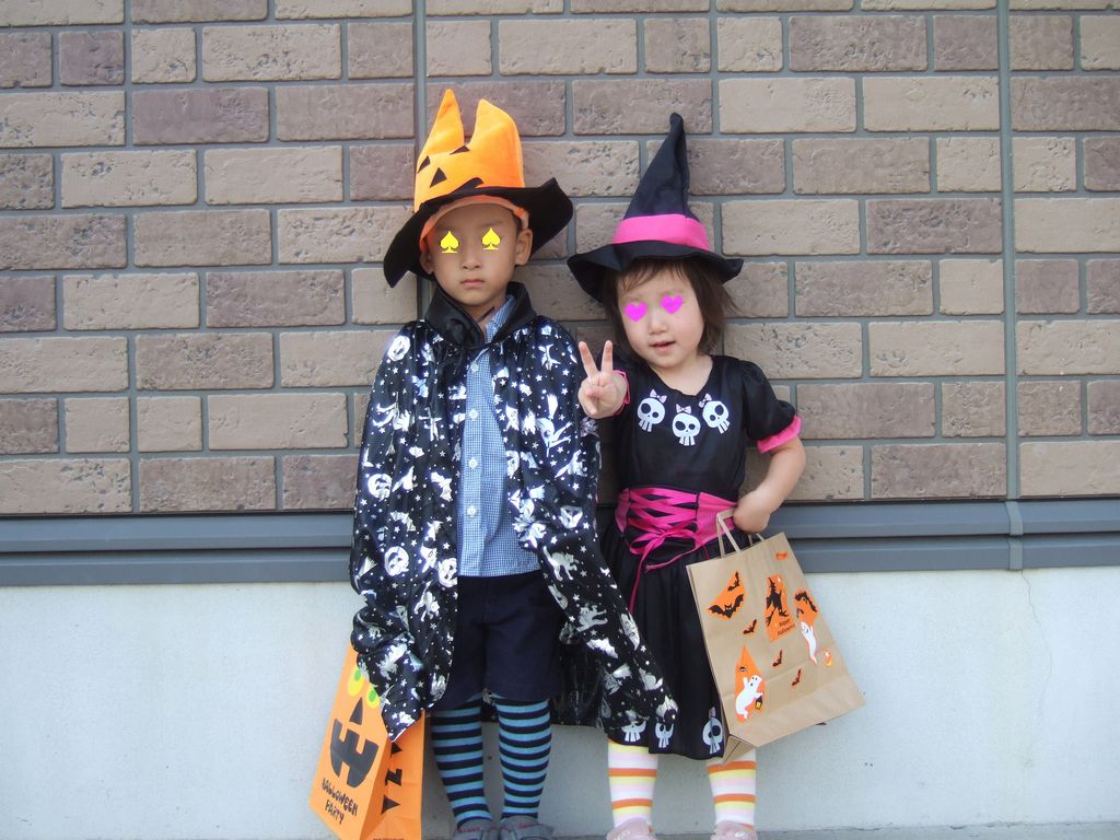 途中で道路を渡ったり、オートロックのマンションの部屋番号を押したりしないといけないので、何人かママが付き添っています。またお友達のばぁばがDVD撮影係として来てくれました。子どもたちは手をつないでお友達の家を巡って楽しそうでした。あるお家でドラキュラに仮装したママが子供たちを驚かすと《いぬ》は怖がって泣いていたそうです。でも、お菓子をもらうとご機嫌になったそうです。年長さんの女の子が《いぬ》の面倒を見てくれて、《とり》は年少さんと3歳の男の子の面倒を見ていました。