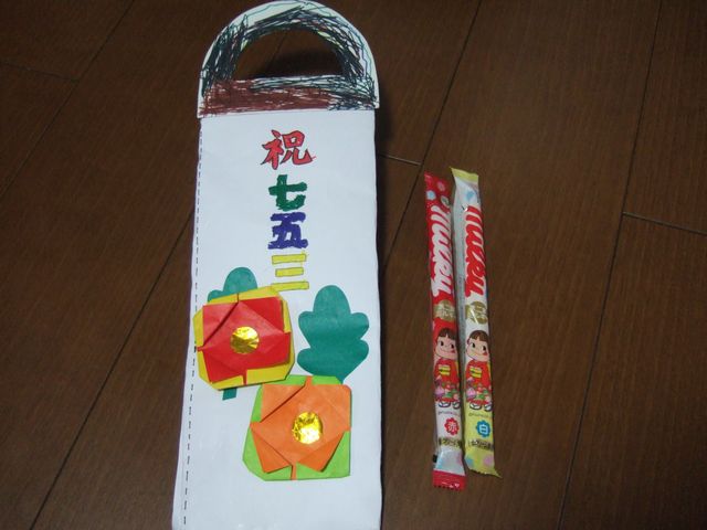 《とり》の幼稚園では、園児全員で近くの神社に七五三のお参りに行きました。千歳飴は母の会からいただき、袋は自分で作ったようです。