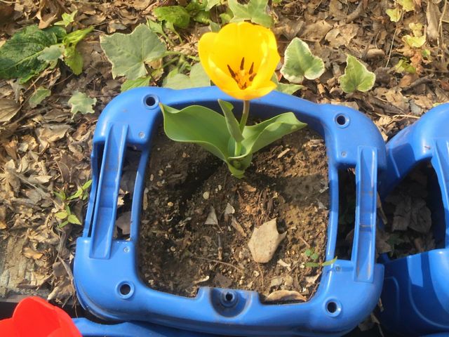 チューリップ 小学校 2014.04.12(土) 《いぬ》が学校で育てているチューリップを見てきました。きれいな黄色のチューリップが咲いていました。でも《いぬ》は球根を深く埋めすぎたので、小さい花しか咲かなかったと言っていました。