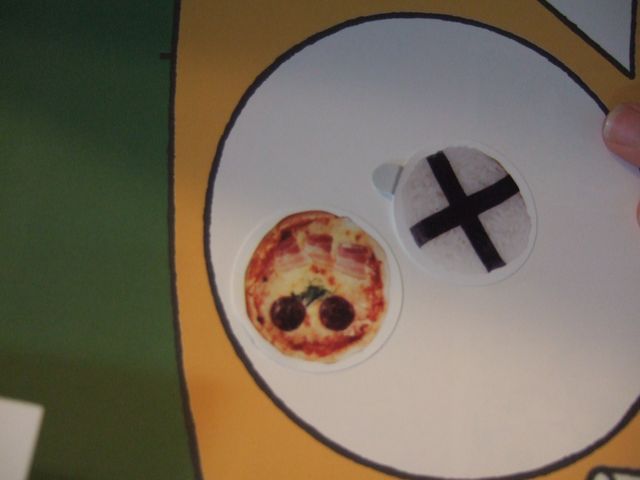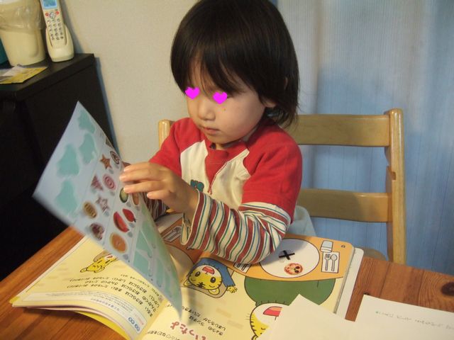 お勉強 子育て 2009.11.17(火) 朝から雨で外では遊べないので、《へび》が《いぬ》にしまじろうの教材でお勉強をさせていました。丸いおにぎりのシールを見せて、〇△×のどれかと聞くと、「バツ」と答えていました。海苔の形がバツなので間違ってはいませんが、想定外の回答です。。。