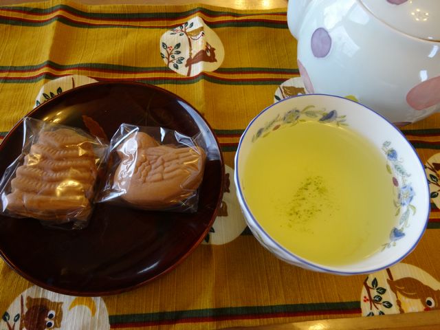 おやつ 食べ物 2014.05.09(金) ばぁばからもらった浅草の人形焼きと静岡で買った八十八夜摘みのお茶をおやつにいただきました。子供たちがあっという間に食べてしまいました。 頂いたバウムクーヘンも子供たちがけっこう食べました。