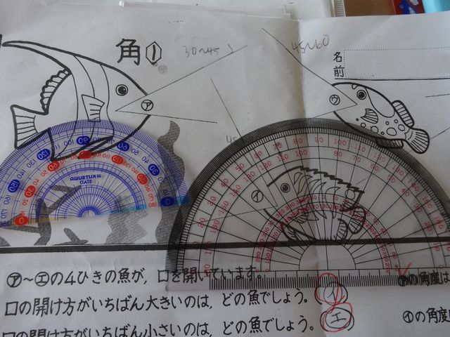 分度器 小学校 2014.05.09(金) 《とり》が学校の宿題のプリントを持ち帰りました。角度の問題ですが分度器が大きすぎて測れないようで30~45度とか、かなりアバウトに書いたまま先生に提出したようです。不便なので自宅用に小さい分度器を購入しました。