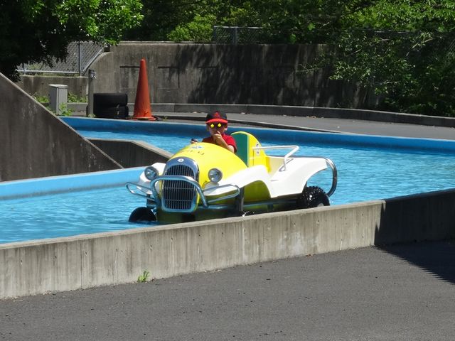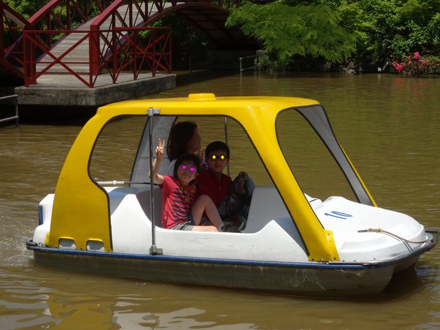 しばらく遊んでから予約しておいたバーベキュー場へ行って、バーベキューをしました。炭も用意してくれるので、食材だけを持っていけば、バーベキューが出来ます。いろいろなものを焼いて食べました。車でいったのでビールは飲めませんでしたが、ノンアルコールビールで気分だけは味わいました。バーベーキューが終わってからは、スワンボート、水陸両用自転車、タンデム自転車に乗ったり、遊具で遊んだりしました。とても暑かったですが、《とり》も《いぬ》も楽しかったようです。