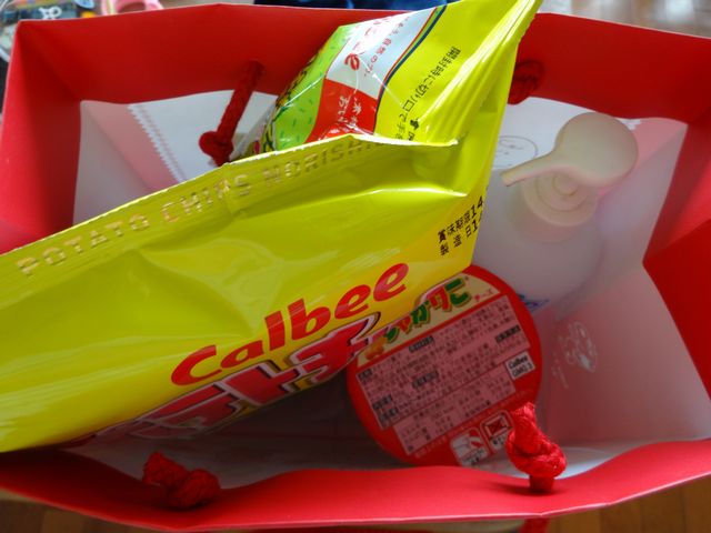 《とり》がお友達の家に遊びに行きました。クラスで吐く風邪が流行っているので、お菓子と一緒に消毒液も持っていっていました。