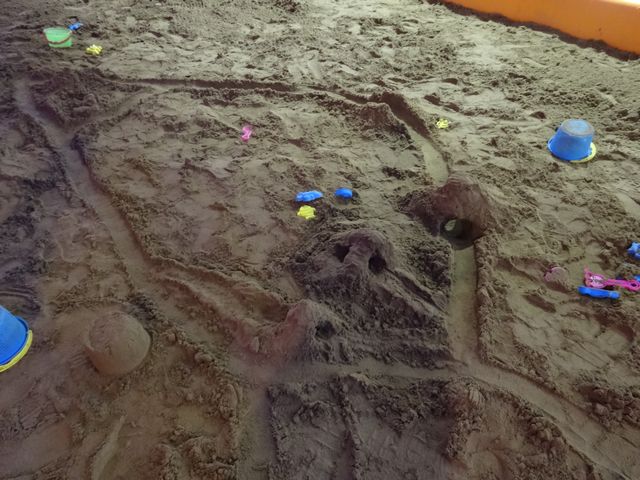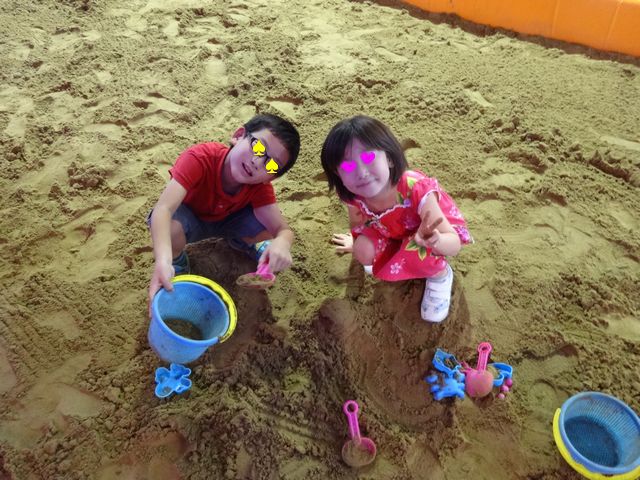 彫刻を見てから、《とり》と《いぬ》は砂場で遊びました。公園の砂場と違って砂がよく固まるので楽しいようです。他にほとんど人がいなかったので、たくさん山を作ってトンネルを掘っていました。