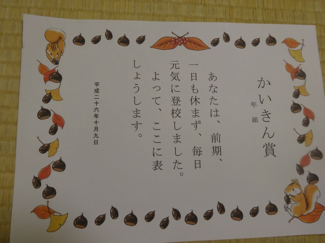 皆勤賞 小学校 2014.10.17(金) 《いぬ》が学校で皆勤賞をもらいました。一年生の時からまだ一度も休んでいません。会社では異動や産休に入る人からお菓子をいただきました。『ありがとう』と文字が入っているどら焼きには感動しました。夕方はふるさと納税のめちゃ大きい梨が届きました。すごく甘くておいしいです。