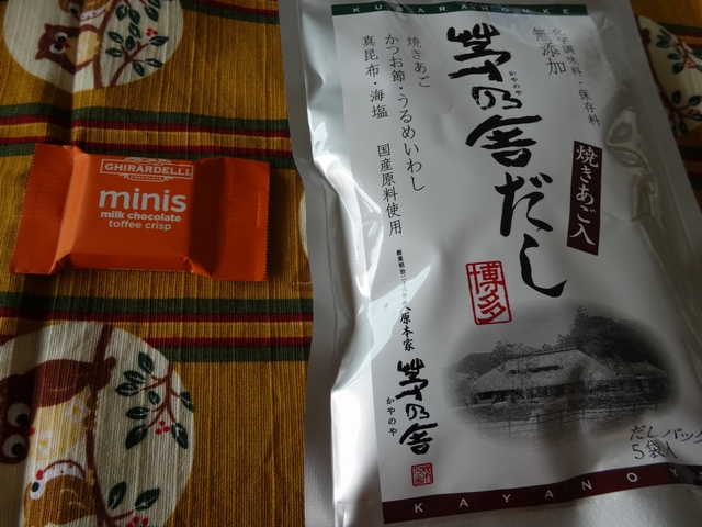 会社で福岡やカリフォルニアのお土産をいただきました。お菓子のお土産が多いですが、出汁もうれしいです。