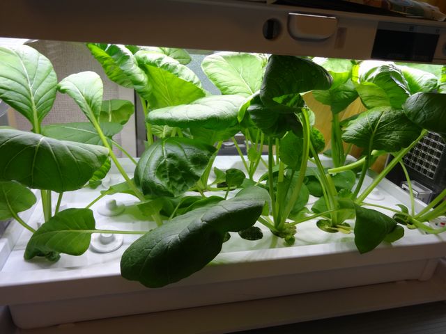 水耕栽培器でこまつなを作ってみました。思っていたよりも大きく育ったので天井に当たってしまっていますが、おいしそうなこまつなが出来ました。