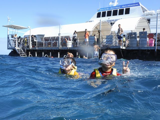 グレートバリアリーフでは、ポンツーンという桟橋に行きます。まずは半潜水艇に乗って海の中を見ました。運よくウミガメも見ることができました。お昼ご飯を食べてからはシュノーケリングでグレートバリアリーフを堪能しました。《とり》と《いぬ》も足ひれやシュノーケルをつけて楽しんでいました。ナポレオンフィッシュも見ることができて大満足です。シュノーケルの後はタッチングプールの片付けのお手伝いでなまこを海に帰してあげました。