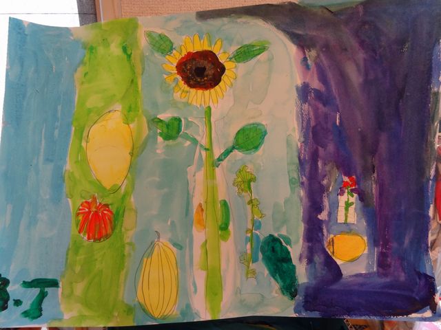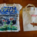 《いぬ》がアトリエで絵をかいてきました。カバンやティーシャツに書く絵も考えてきたようです。