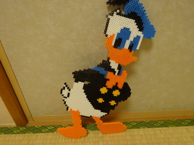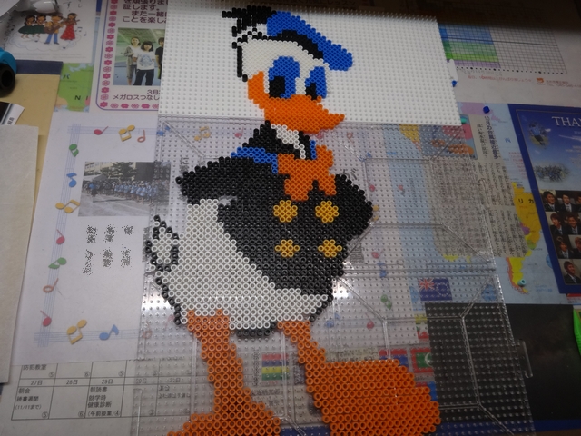 《とり》がアイロンビーズでドナルドダックを作っていました。大きなサイズの大作です。