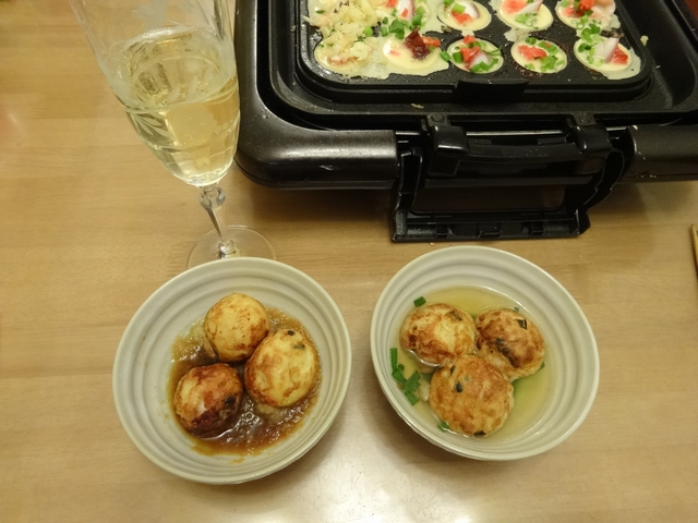 今年初めてのたこ焼きです。シャンパンと一緒においしくいただきました。お昼はデパートのセールで半額だったお弁当です。どれもおいしかったです。