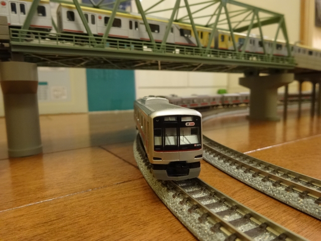 《とり》がリビングに線路を広げて遊んでいました。鉄橋にも東急の電車が走っています。