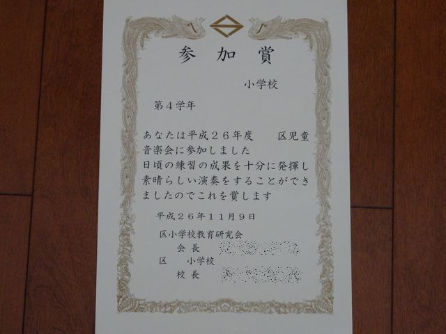 《とり》が去年の秋に参加した音楽会の賞状をもらってきました。ピアノで伴奏を弾いたので、賞状も演奏と書かれています。