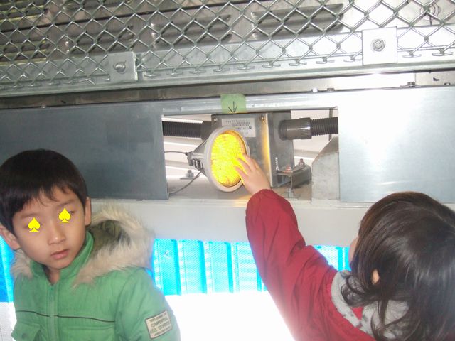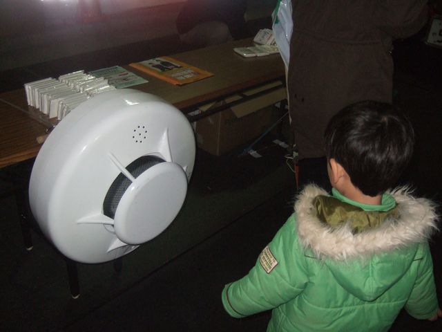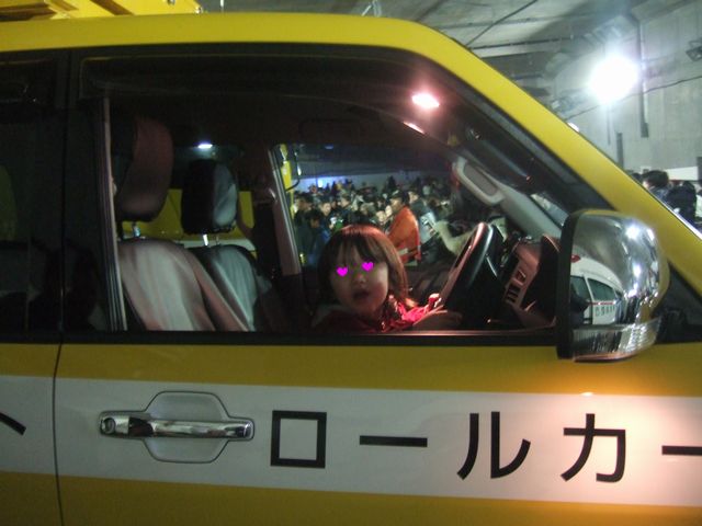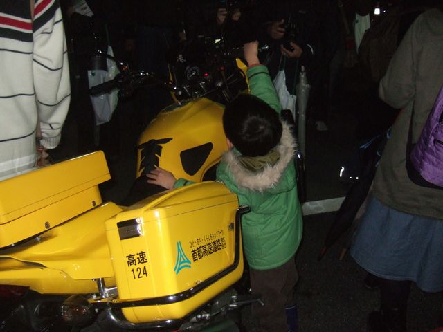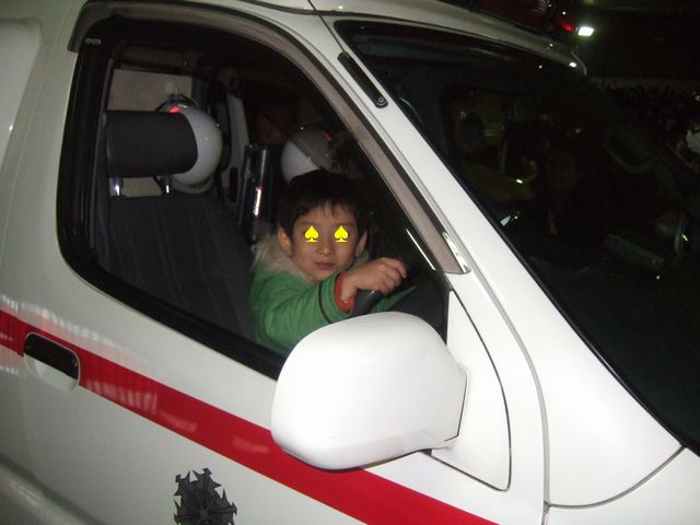 こういうイベントでお約束の車両展示もありました。救急車や首都高の管理用車両の運転席に座ってご満悦です。首都高バイク隊の黄色いバイクも展示されていました。《とり》は初めてみる黄色いバイクに興味津津でした。でも一番喜んでいたのは消防車のコーナーにあった巨大な火災警報器でした。。。