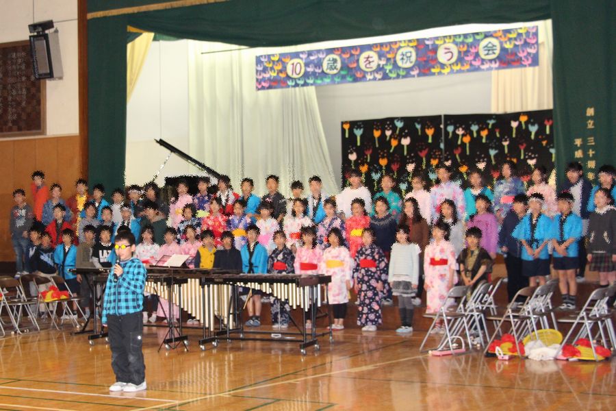 10歳を祝う会 小学校 2015.02.17(火) 《とり》の10歳を祝う会でした。《とり》は4曲伴奏と音楽劇のピアノを担当しました。劇のピアノは耳コピーだったり、前日に楽譜をもらう曲もありましたが、しっかり弾けていました。ピアノ以外にお琴があったり歌のソロが2曲あったりすばらしかったです。花笠を踊る女の子たちは髪型も気合いが入っていて、男子の八木節もセンター争いがあったそうです。《とり》が最後の挨拶をしていました。