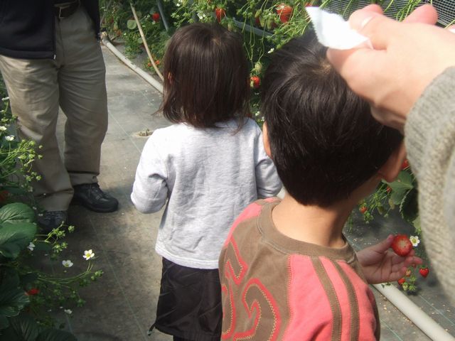 続いて少し道に迷いながら「白浜いちご狩りセンター」に行きました。いろいろな品種のいちごを食べ比べができる所ですが、食べごろのは章姫と紅ほっぺだけでした。果肉にそこそこ硬い紅ほっぺよりは柔らかい章姫の方が食べごろのいちごがいっぱいありました。《とり》も《いぬ》も指が真っ赤になるまでいちごを食べました。