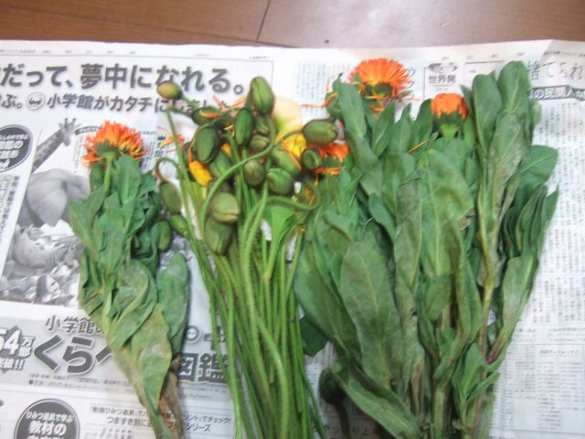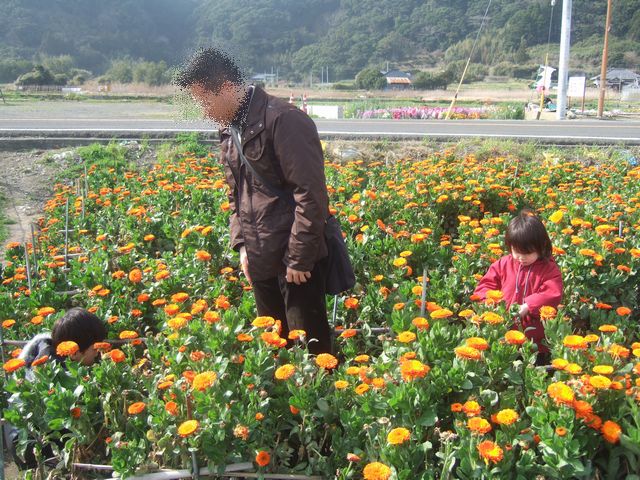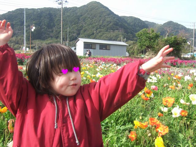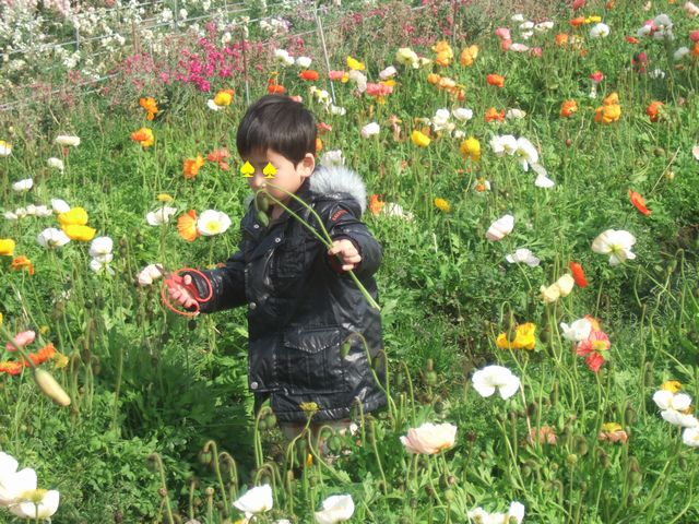 続いて房総フラワーラインを通って白間津のお花畑に向かいました。房総フラワーラインは道の両脇に植えられた菜の花が満開でした。お花畑ではお花摘みをしました。色々な色のポピーとキンセンカを摘みました。ポピーはつぼみの摘んで帰るのですが、《とり》はお花が咲いているのを摘みたがっていました。