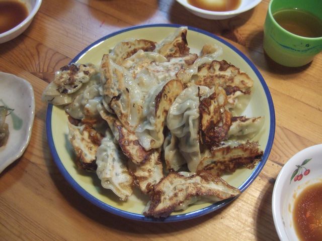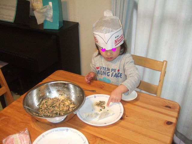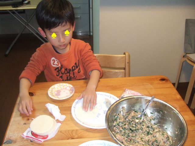 手作り餃子 食べ物 2010.03.28(日) 夜ご飯の餃子をみんなで作りました。《とり》も張り切って作ってくれますが、ワンタンみたいになった餃子は《たつ》と《へび》で手分けして作り直しました。《いぬ》はまだ作れないので具を乗せる係にしました。《とり》も《いぬ》も自分で作った餃子を「おいしい、おいしい」と言いながらいっぱい食べたので50個の餃子が一瞬でなくなってしまいました。