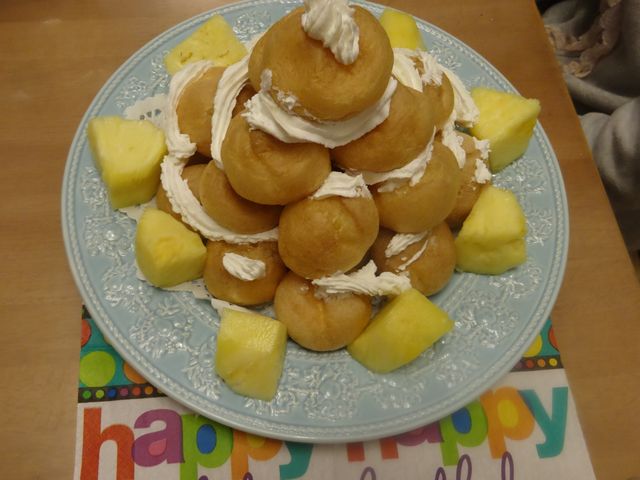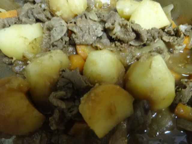 《へび》の誕生日なので、夜ごはんは《とり》が肉じゃがを作りました。ケーキはシュークリームで《いぬ》が作ってくれました。