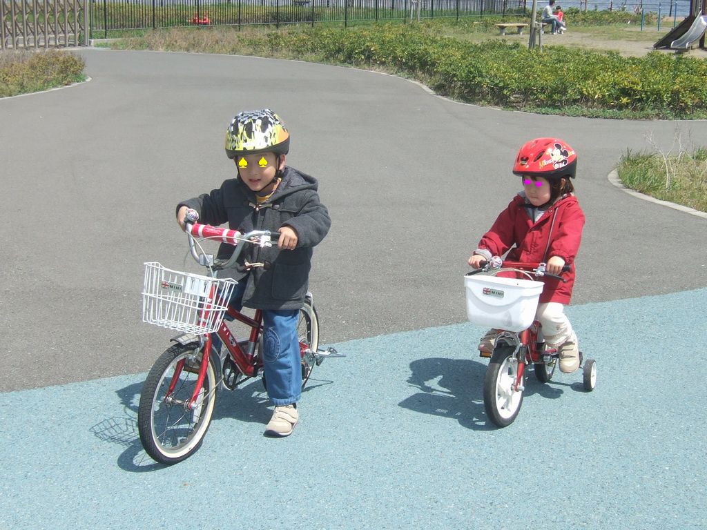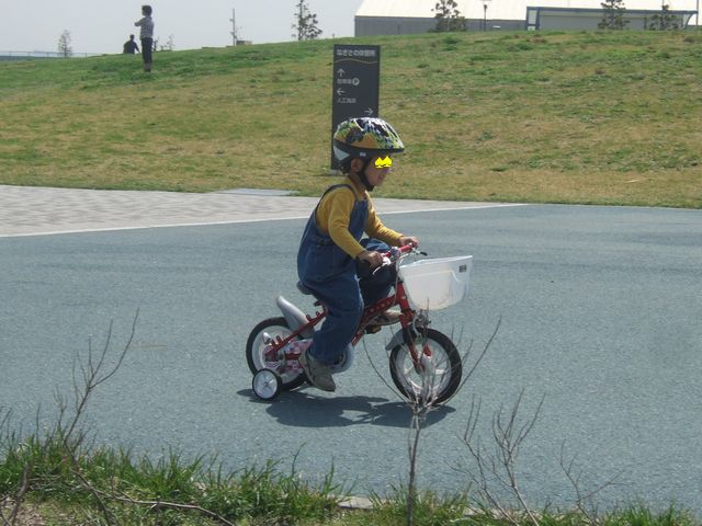 自転車練習 子育て 2010.04.10(土) 先週に引き続いて《とり》の自転車の練習です。スタンドを立てることはできるようになりましたが、まだ漕ぎ始めるのはフラフラです。《とり》と《いぬ》で仲良く自転車を漕いでいましたが、しばらくすると《いぬ》はだんだん飽きてきて、自転車を降りて歩いていました。《いぬ》の自転車を《とり》が借りて乗り回していました。
