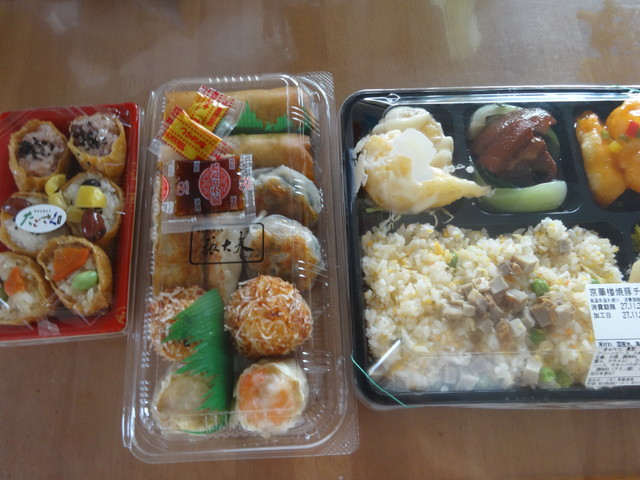 お昼ご飯と子供たちのおやつに買ったおかずです。左の稲荷と真ん中の点心を二人でおやつに分け合っていました。