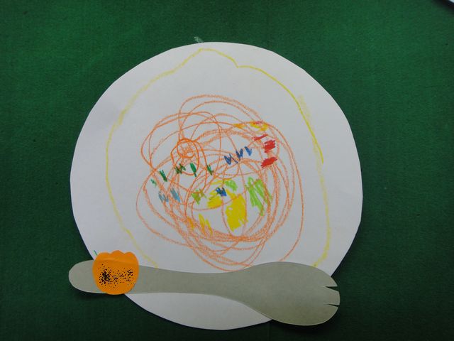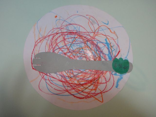 左側の作品が教室に飾ってあった《いぬ》のはじめての作品です。《いぬ》の解説によるとトマト味のスパゲティで野菜がたくさん入っているそうです。左利きなのでフォークの置き方も左利き仕様になっています。ちなみに右側は2年前の《とり》のはじめての作品です。