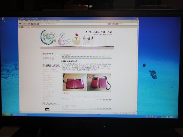 ディスプレイ パソコン 2010.04.17(土) 先週壊れてしまったパソコンのディスプレイを買い替えました。23インチのディスプレイにしたので、無駄にでかく画面の端の方は全く使いませんが、きれいに映るようになったので満足です。
