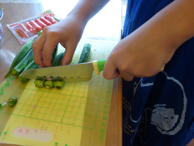 サラダ 小学校 2015.08.05(水) 《とり》の家庭科の宿題は今まで習ったものの中から作るという事だったので、オクラのサラダを作ってもらいました。美味しくできています。あとはレポートを書いたら完成です。