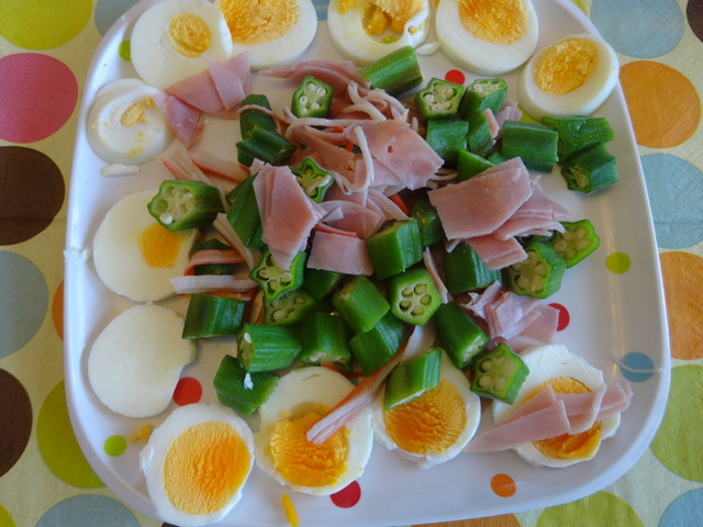 おくら、かにかま、ハム、卵・・