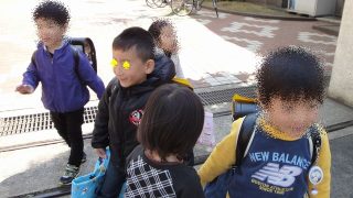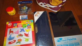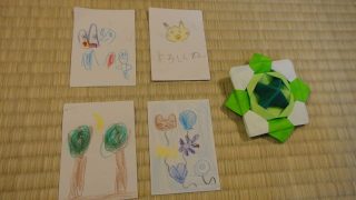 《とり》が小学校で1年生の他のクラスの子と名刺交換をしたと言って、メッセージカードを持って帰ってきました。名前と絵が書いてあります。コマは2年生が折ってくれたそうです。