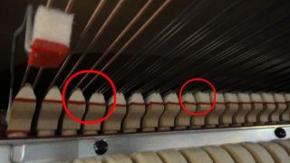 習い事 ピアノ 今日もピアノ工房の人に来ていただきました。《へび》は低音部の音がやや気になり、《とり》は高音部の音が気になるので、念のために見てもらいました。二人が気になる箇所はフェルトの形状がちょうど変わる部分なので、しょうがないそうです。写真の赤丸部分... 2011.09.08(木) 2 習い事