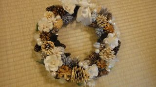 《へび》がクリスマスリースを作りに行ってきました。3時間半もかかりましたが、満足な出来上がりです。玄関に飾る予定です。
