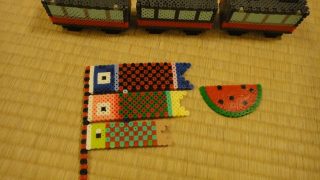 子育て パーラービーズ 一日雨で午後はピアノのレッスンがあるので、午前中はパーラービーズをして遊んでいました。《いぬ》はこいのぼりとスイカ。《とり》は立体作品で電車を作っていました。なかなかよくできています。 2013.04.02(火) 2 子育て